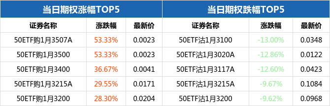 50ETF期权当日有144个合约正在交易。从涨跌幅来看,50ETF期权合约中,50ETF购1月3507A涨幅最大,为53.33%,报收0.0023元;50ETF沽1月3100跌幅最大,为13.00%,报收0.0348元。