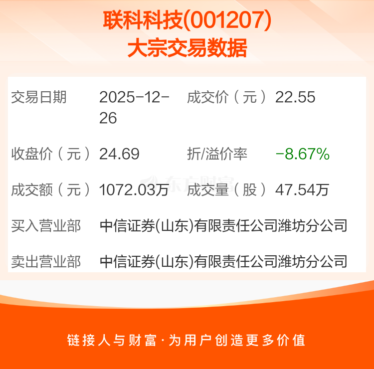 2025年12月26日,联科科技发生1笔大宗交易,共成交47.54万股,成交金额1072.03万元,占其流通市值比例为0.22%。