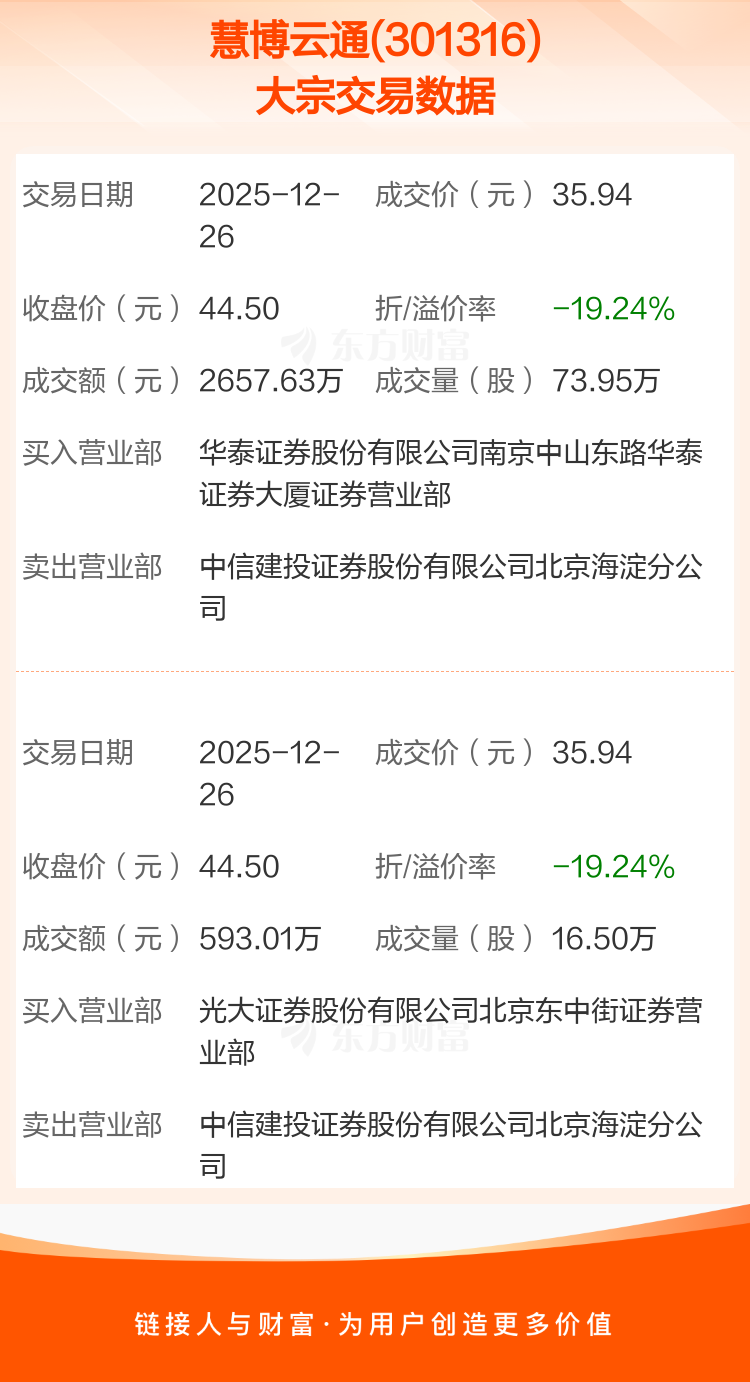 大宗交易:慧博云通成交3250.64万元,折价19.24%(12-26)