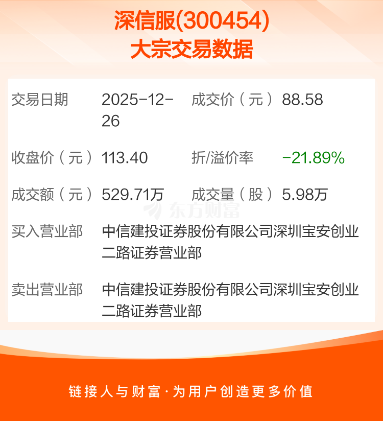 大宗交易:深信服成交529.71万元,折价21.89%(12-26)