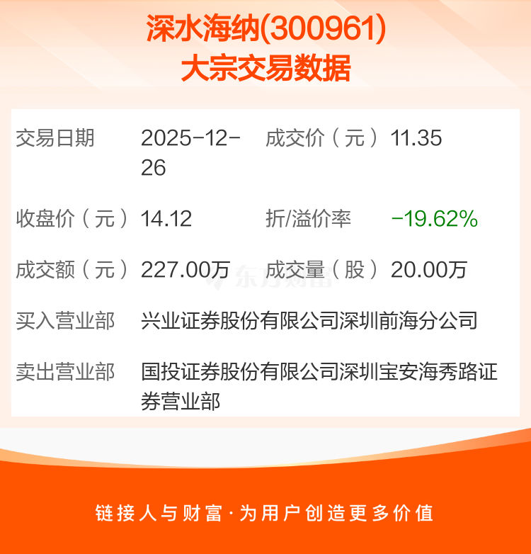 2025年12月26日,深水海纳发生1笔大宗交易,共成交20.00万股,成交金额227.00万元,占其流通市值比例为0.11%。