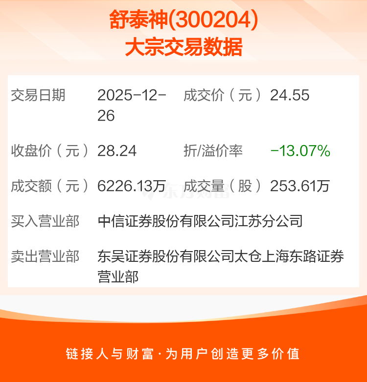 大宗交易:舒泰神成交6226.13万元,折价13.07%(12-26)