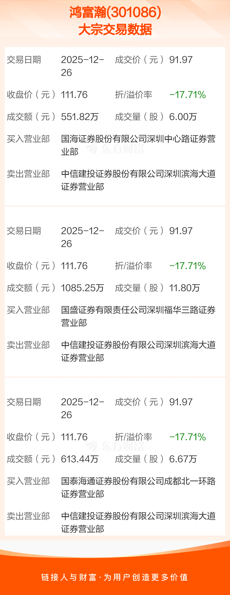 大宗交易:鸿富瀚成交2250.51万元,折价17.71%(12-26)