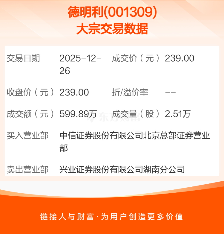 2025年12月26日,德明利发生1笔大宗交易,共成交2.51万股,成交金额599.89万元,占其流通市值比例为0.02%。