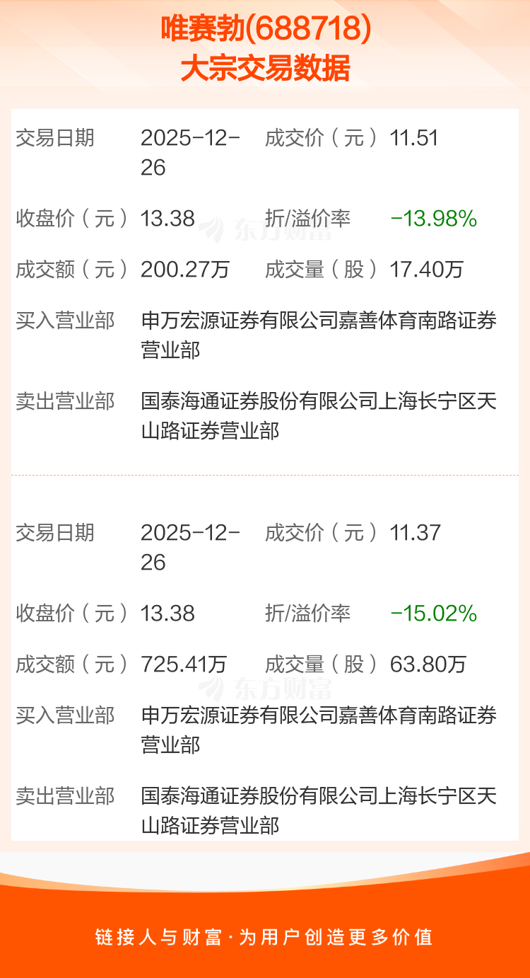 2025年12月26日,唯赛勃发生2笔大宗交易,共成交81.20万股,成交金额925.68万元,占其流通市值比例为0.40%。