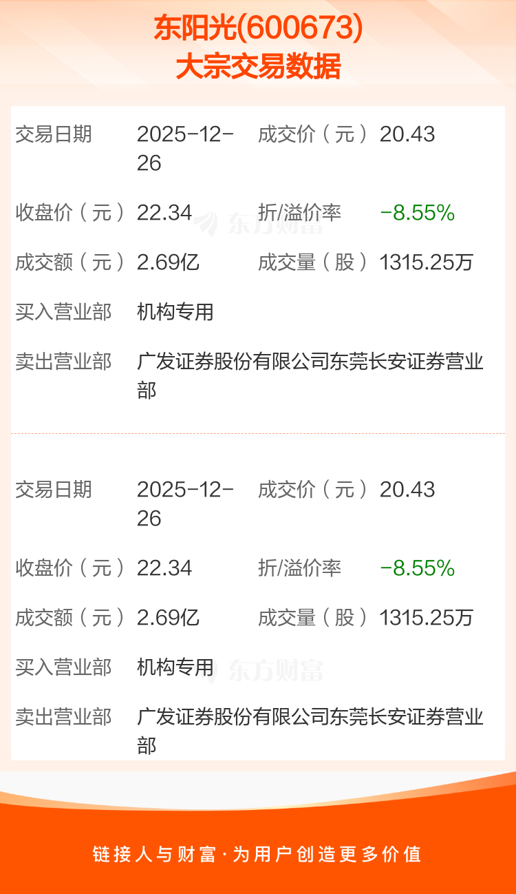 大宗交易:东阳光成交5.37亿元,折价8.55%(12-26)