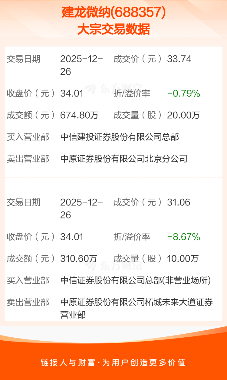 2025年12月26日,建龙微纳发生2笔大宗交易,共成交30.00万股,成交金额985.40万元,占其流通市值比例为0.29%。