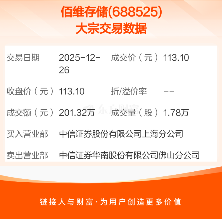 2025年12月26日,佰维存储发生1笔大宗交易,共成交1.78万股,成交金额201.32万元。