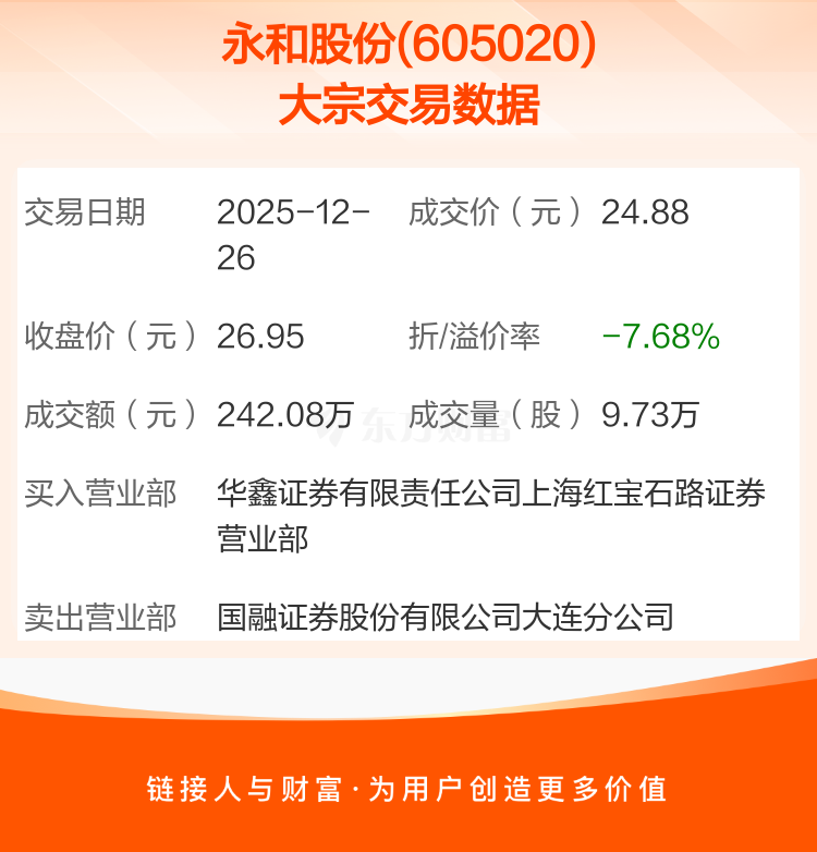 2025年12月26日,永和股份发生1笔大宗交易,共成交9.73万股,成交金额242.08万元,占其流通市值比例为0.02%。