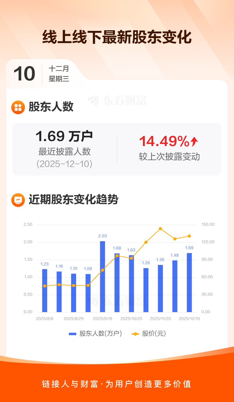线上线下最新披露数据显示,截至12月10日公司股东户数为1.69万户,较上期(2025年11月28日)增加2144户,增幅为14.49%。户均持有流通股数量由上期的3537股下降至3089股,户均持股金额由上期的44.47万元减少至40.36万元。