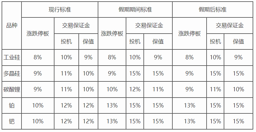 自2025年12月30日(星期二)结算时起,工业硅期货合约涨跌停板幅度及交易保证金标准维持不变;多晶硅期货合约涨跌停板幅度维持不变,投机交易保证金标准、套期保值交易保证金标准调整为15%;碳酸锂期货合约涨跌停板幅度调整为10%,投机交易保证金标准调整为12%,套期保值交易保证金标准调整为11%;铂、钯期货合约涨跌停板幅度调整为13%,投机交易保证金标准、套期保值交易保证金标准调整为15%。