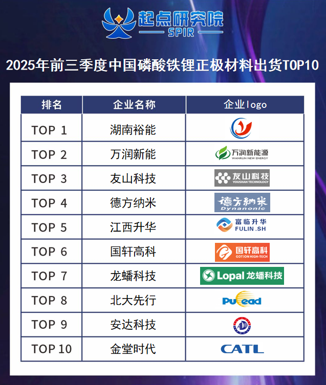 这三家企业均为磷酸铁锂行业头部厂商,产能与市场占有率位居行业前列。据起点研究院(SPIR)统计,2025年1-9月中国锂电池磷酸铁锂正极材料出货量前十企业中,湖南裕能、万润新能、德方纳米分别位列第一、第二及第四。