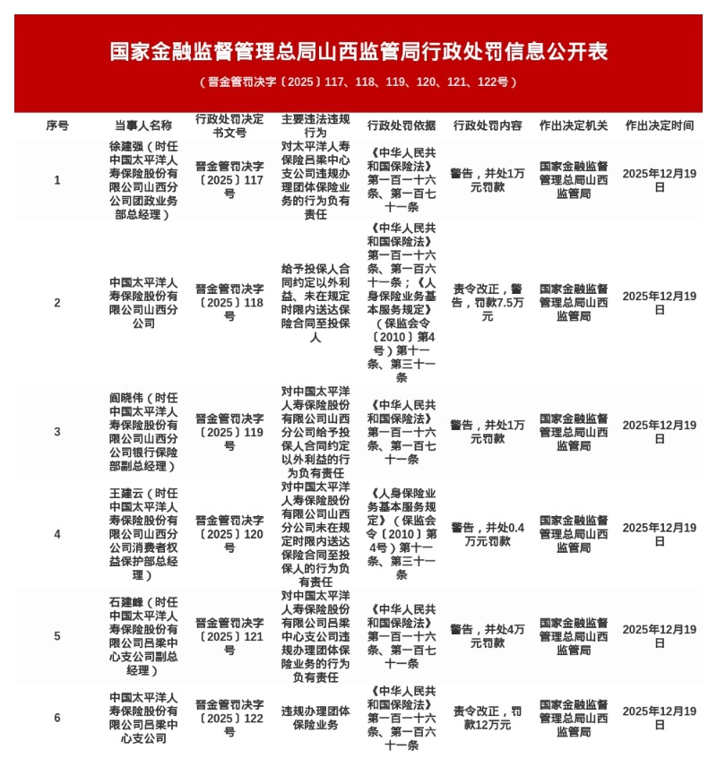 蓝鲸新闻12月26日讯,近日,国家金融监督管理总局山西监管分局发布了多张罚单,剑指中国太平洋人寿保险股份有限公司山西分公司、吕梁中心支公司及其相关责任人。