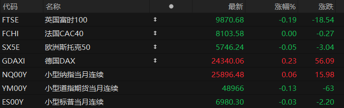 周五盘前,美股三大股指期货涨跌不一,欧洲主要指数多数下跌。截至发稿,纳斯达克100指数期货涨0.06%,标普500指数期货跌0.03%,道指期货跌0.13%。