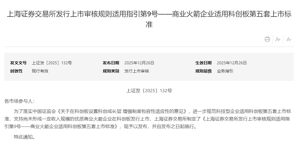 12月26日,上海证券交易所制定的《上海证券交易所发行上市审核规则适用指引第9号——商业火箭企业适用科创板第五套上市标准》(以下简称《指引》)发布,并自发布之日起施行。
