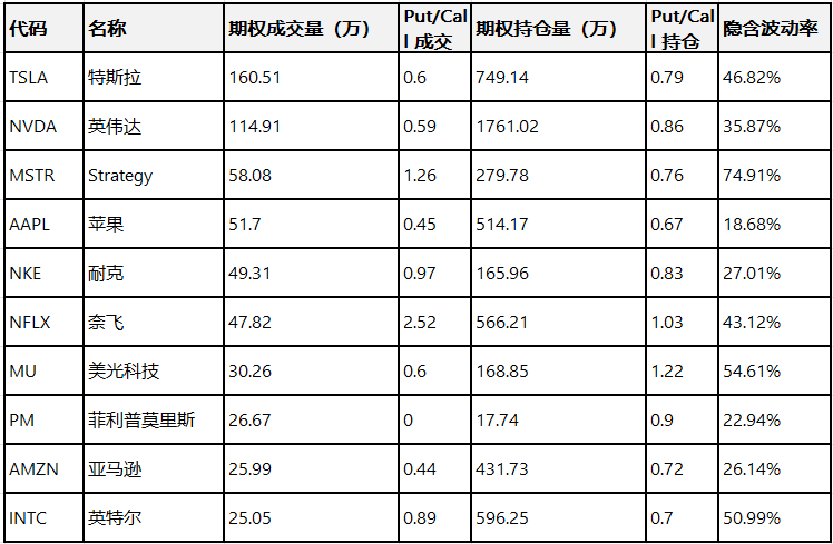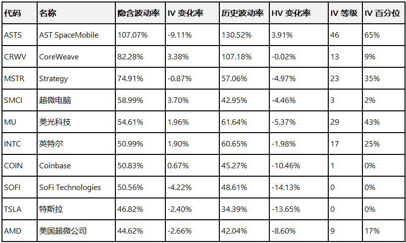 美股期权波动率排行榜前十(标的市值>100亿美元,且期权成交量>10万张)