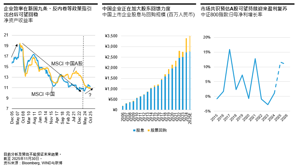 对于A股市场,联博基金保持审慎乐观的态度,投资者不妨留意政策变革所带来的深远影响。“新国九条”标志着监管重心转向长效的资本市场制度建设,核心是通过分红、回购等来提升上市公司回报,并改善企业效率。2025年的“反内卷”指引逻辑也类似,希望改善部分企业无序竞争的困境。这凸显了政策将持续专注于提升整体经济效率,也就是服务于高质量发展框架下的政策方向。