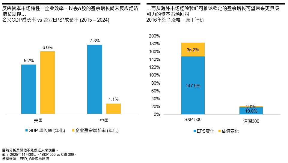 基于发达市场的经验,可以看到较稳定的资本市场回报关键在于长期稳定的盈利增长。而要实现可持续的盈利增长,企业效率至关重要。比如,美国企业的盈利增长长期超过名义GDP增速。因此,提升效率或将是推动中国实现更稳定的盈利增长和资本市场表现的关键所在。
