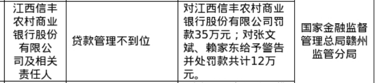 罚单显示,江西信丰农村商业银行股份有限公司的主要违法违规事实(案由)为:贷款管理不到位。