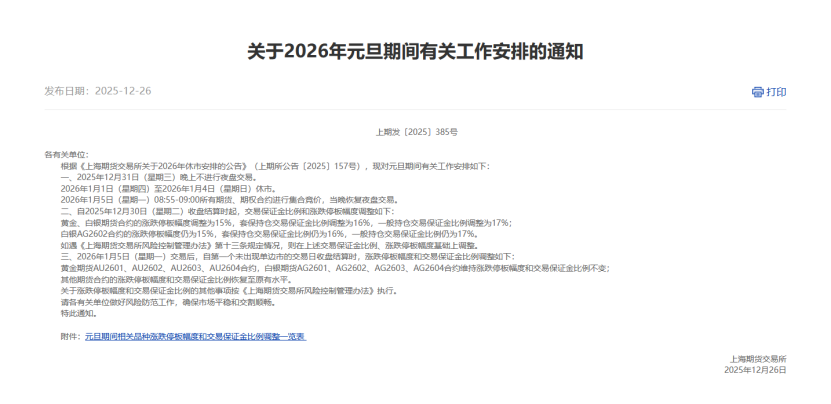 在另一条通知中,上期所还对黄金白银期货相关合约交易保证金比例和涨跌停板幅度做出调整:自2025年12月30日(星期二)收盘结算时起,黄金、白银期货合约的涨跌停板幅度调整为15%,套保持仓交易保证金比例调整为16%,一般持仓交易保证金比例调整为17%; 白银AG2602合约的涨跌停板幅度仍为15%,套保持仓交易保证金比例仍为16%,一般持仓交易保证金比例仍为17%。