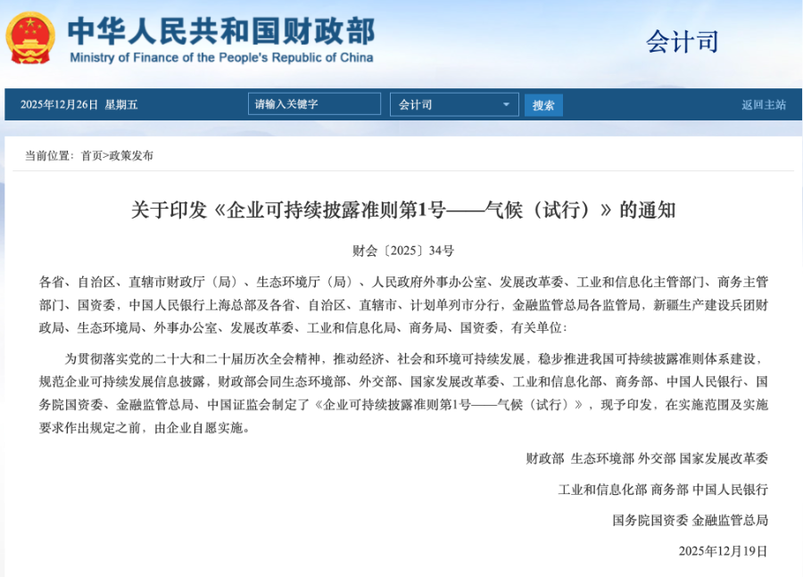 12月25日,财政部会同生态环境部、外交部等9部门《企业可持续披露准则第1号——气候(试行)》(以下简称《气候准则》)。《气候准则》是国家统一的可持续披露准则体系中的第一个具体准则,自今年4月底公开征求意见至今,终于“靴子落地”。业内认为,这是我国向统一可持续披露准则体系迈进的一大步。