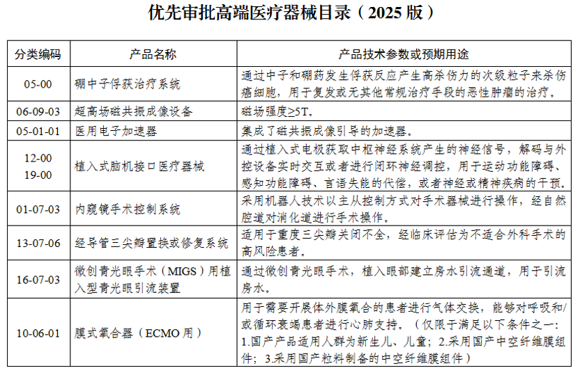 上证报中国证券网讯(记者张雪)12月26日,国家药监局正式发布了《优先审批高端医疗器械目录(2025版)包括硼中子俘获治疗系统、超高场磁共振成像设备、医用电子加速器、植入式脑机接口医疗器械、内窥镜手术控制系统、经导管三尖瓣置换或修复系统、微创青光眼手术(MIGS)用植入型青光眼引流装置、膜式氧合器(ECMO用)等8种产品。该目录阐述了产品技术参数或预期用途,自公布之日起施行。