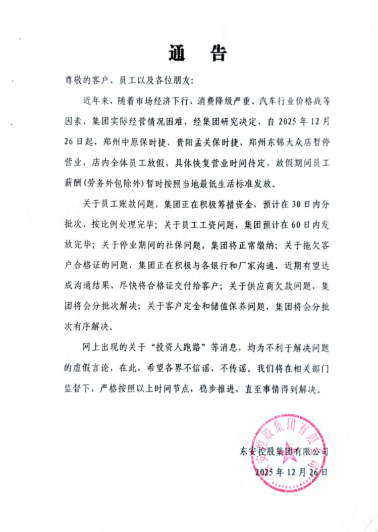 近年来,随着市场经济下行,消费降级严重,汽车行业价格战等因素,集团实际经营情况困难,经集团研究决定,自2025年12月26日起,郑州中原保时捷、贵阳孟关保时捷、郑州东锦大众店暂停营业,店内全体员工放假,具体恢复营业时间待定,放假期间员工薪酬(劳务外包除外)暂时按照当地最低生活标准发放。
