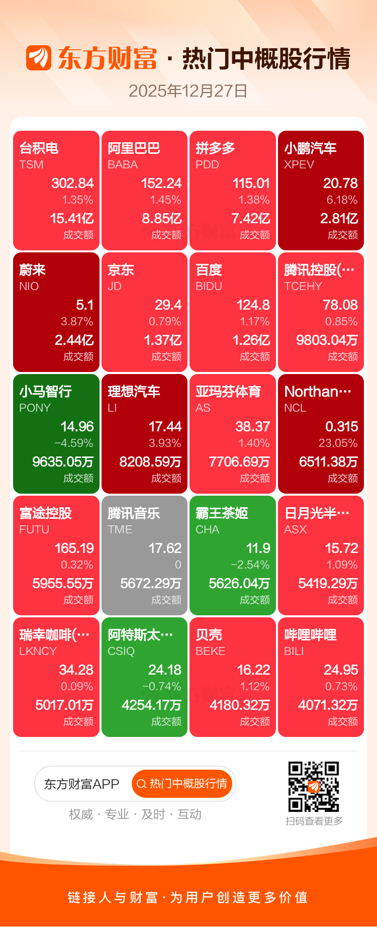 台积电涨1.35%,阿里巴巴涨1.45%,拼多多涨1.38%,小鹏汽车涨6.18%,蔚来涨3.87%,京东涨0.79%,百度涨1.17%,腾讯控股(ADR)涨0.85%,小马智行跌4.59%,理想汽车涨3.93%。