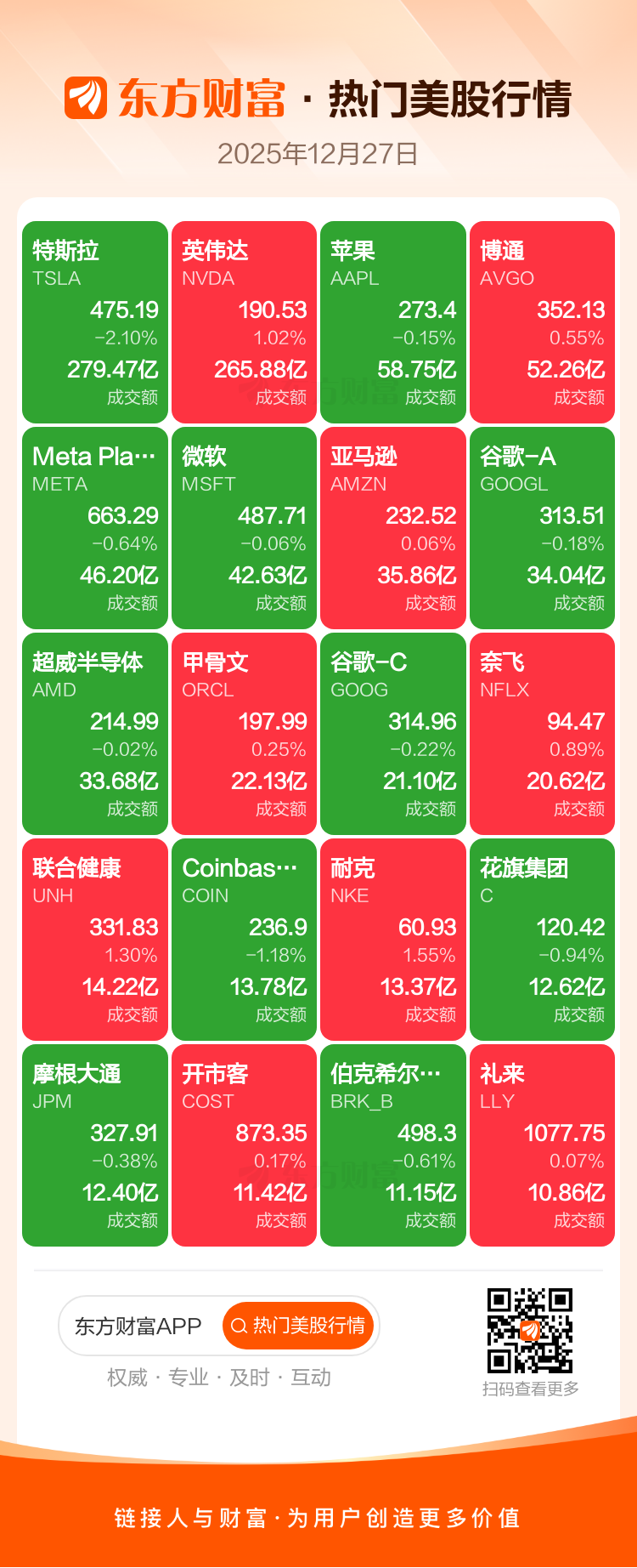 特斯拉跌2.10%,英伟达涨1.02%,苹果跌0.15%,博通涨0.55%,Meta Platforms Inc-A跌0.64%,微软跌0.06%,亚马逊涨0.06%,谷歌-A跌0.18%,超威半导体跌0.02%,甲骨文涨0.25%。