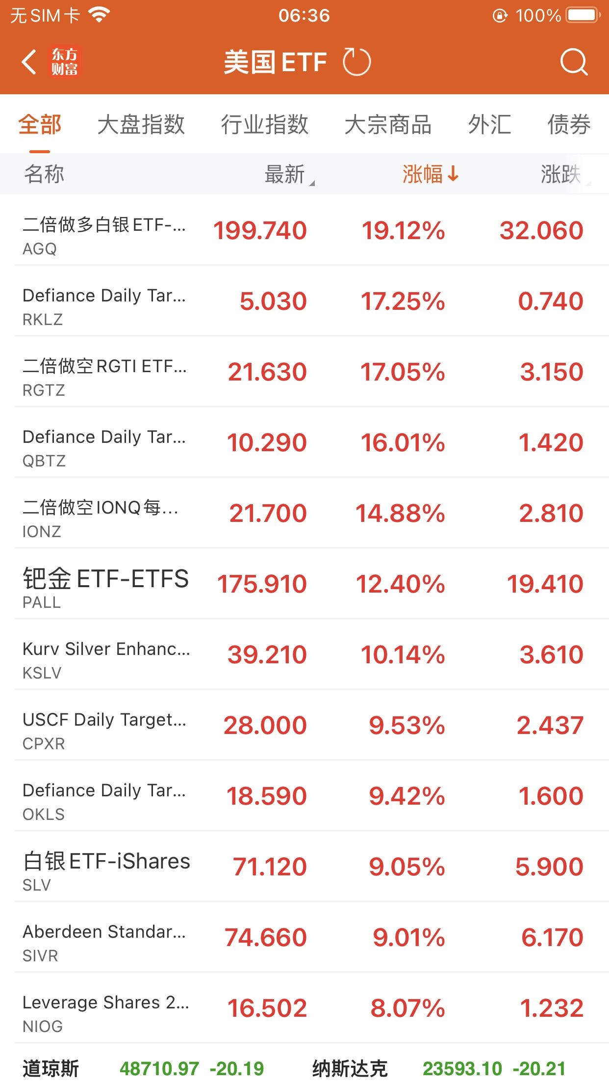 2倍做多白银ETF-ProShares(AGQ.US) 升19.12%,成交额19.57亿美元。