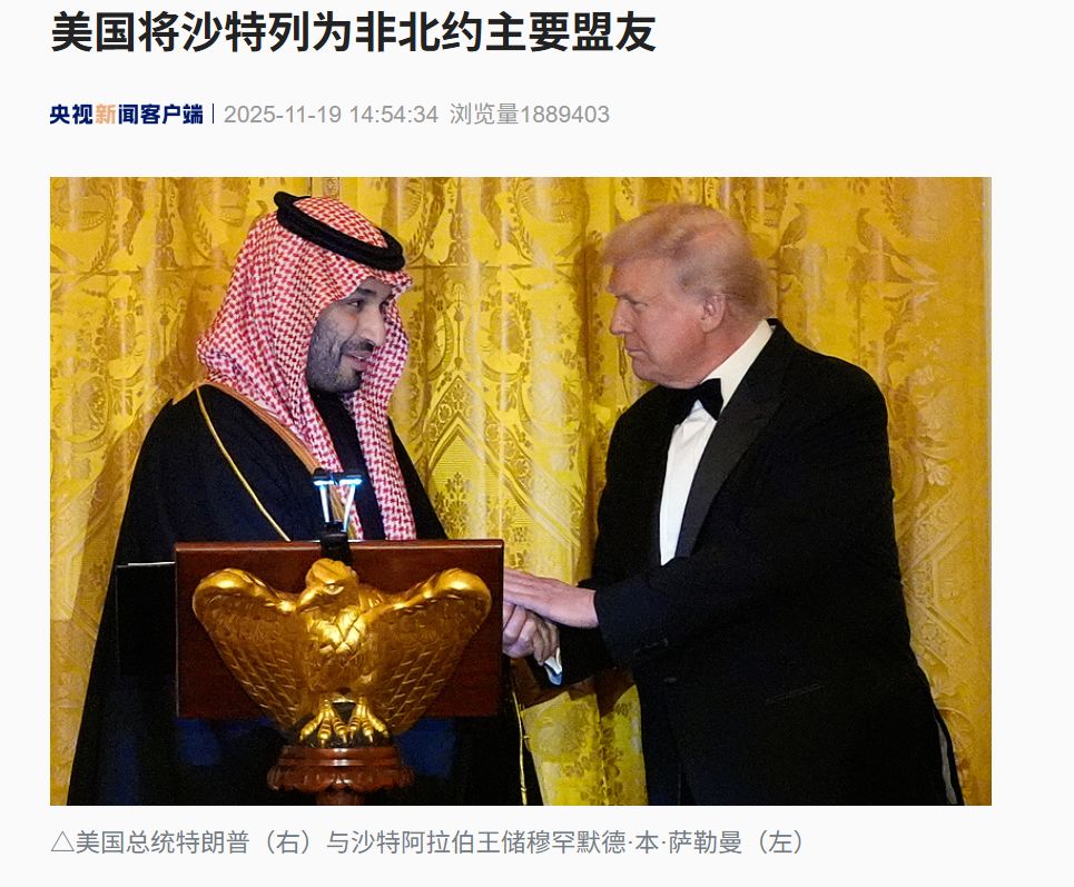 此前,美国总统特朗普11月18日宣布,将沙特阿拉伯列为美国的非北约主要盟友。美沙安全伙伴关系升级。
