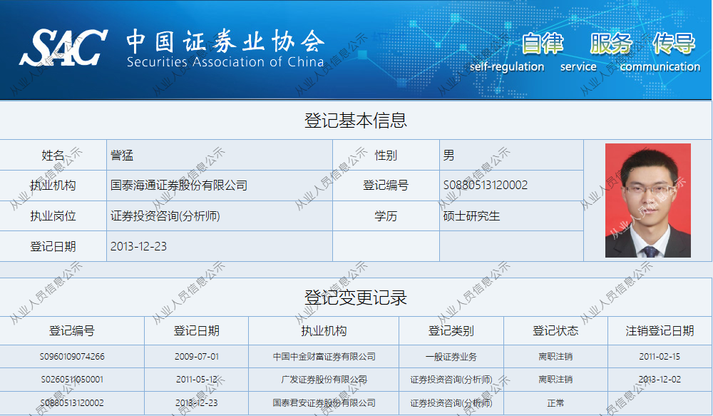 中国证券业协会(下称“中证协”)官网资料显示,訾猛2009年7月执业机构登记为中国中金财富证券有限公司,登记类别为一般证券业务,2011年2月离职注销;2011年5月,訾猛执业机构登记为广发证券,登记类别为证券投资咨询(分析师),2013年12月离职注销。2013年12月至今,訾猛执业机构登记为国泰君安证券,登记类别为证券投资咨询(分析师)。