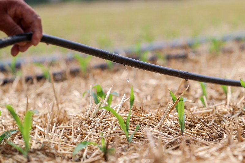 2025年6月18日,村民在河南省商丘市梁园区闫庄新村玉米地里开展节水灌溉作业,查看滴灌设施运行情况。新华社发(李恒摄)