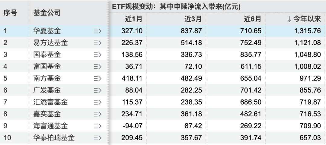 从今年以来资金流向上看,华夏、易方达、国泰、富国旗下ETF资金净流入均超千亿元级别。