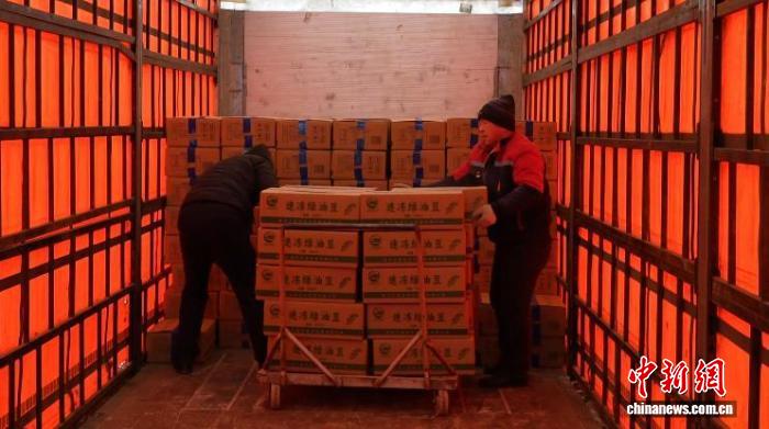 工人将一箱箱同江本地速冻“绿油豆”整齐码放进俄罗斯货车。同江市委宣传部供图