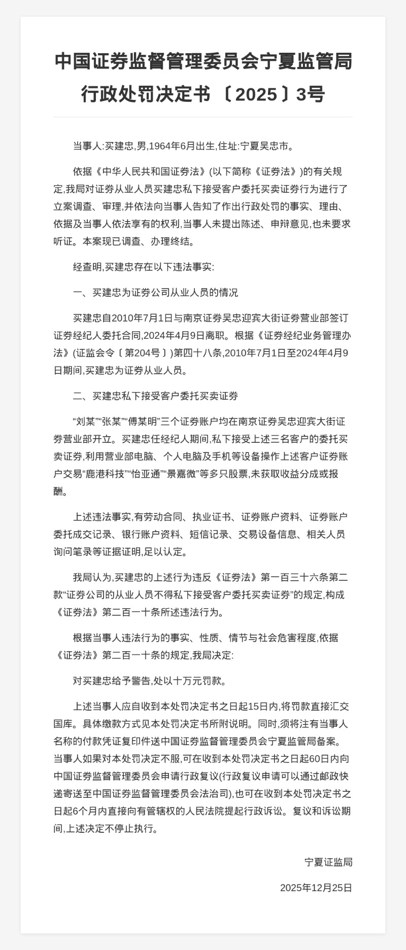 蓝鲸新闻12月27日讯,近日,宁夏证监局发布了一则行政处罚决定书,剑指证券从业人员买建忠。
