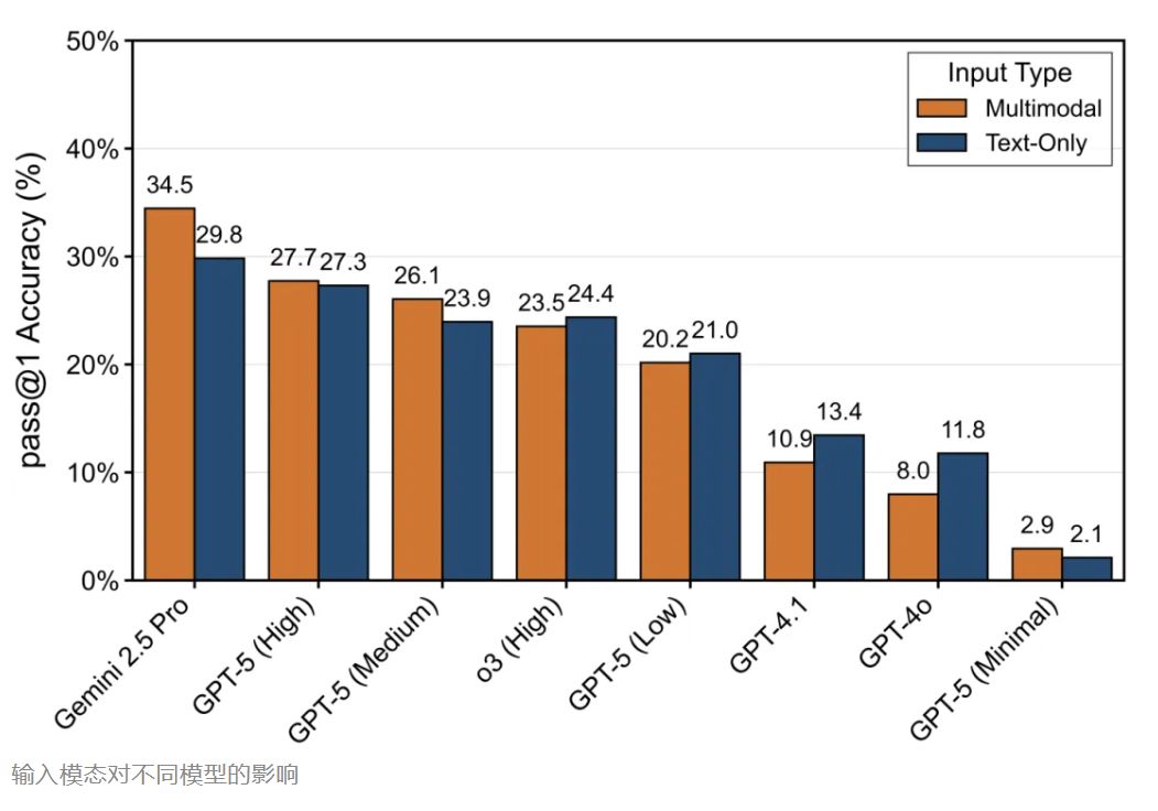 让团队感到意外的是视觉信息带来的困惑。化学的语言是图形,分子结构、反应机理图蕴含着关键信息。然而对于部分模型而言,当引入图像信息时,其准确率不升反降。这说明,当前的AI在将视觉信息转化为化学语义时,仍存在明显的感知瓶颈。