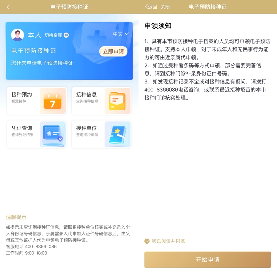 1.具有本市预防接种电子档案的人员均可申领电子预防接种证。支持本人申领,对于未成年人和无民事行为能力的可由近亲属代申领。