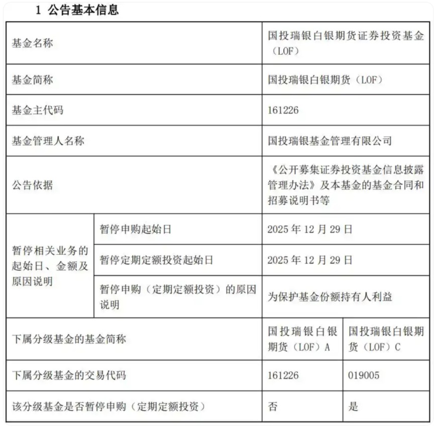 12月26日,国投瑞银白银期货证券投资基金(LOF)发布公告表示,为保护基金份额持有人利益,国投瑞银白银期货证券投资基金(LOF)C类基金份额将从2025年12月29日开始暂停申购。