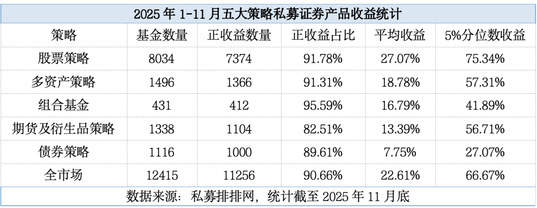 据第三方平台统计,截至2025年11月底,私募证券投资基金今年以来平均收益超20%,正收益占比高达90.66%。其中,股票策略私募基金平均收益超27%,正收益占比接近92%。