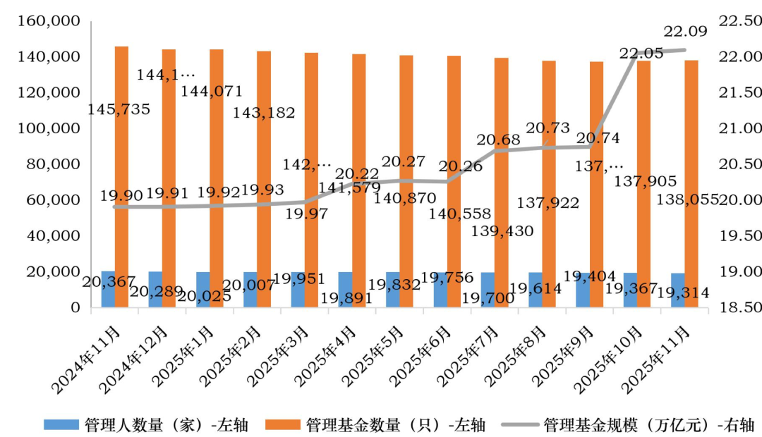 中基协发布数据显示,截至11月末,存续私募基金管理人19314家,管理基金规模22.09万亿元,再度刷新历史新高。