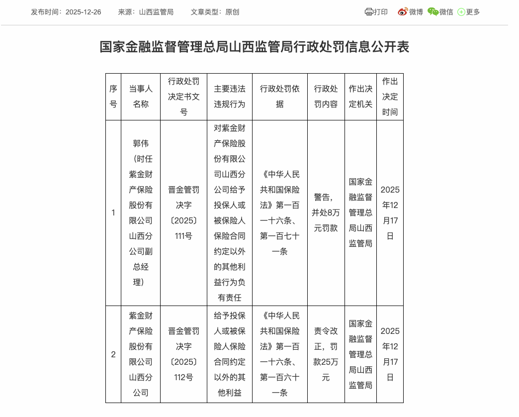 根据国家金融监督管理总局山西监管局12月26日发布的行政处罚信息,涉违规返利,紫金财险山西分公司及时任责任人双双领罚。