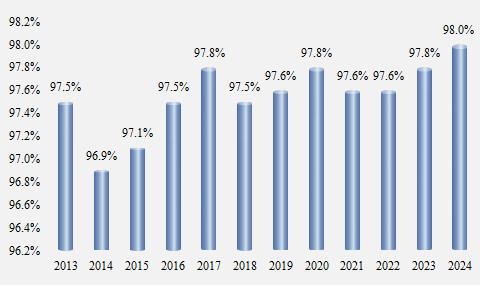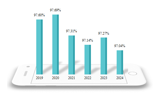 2019-2024年全国食品安全监督抽检合格率。制图/江南大学