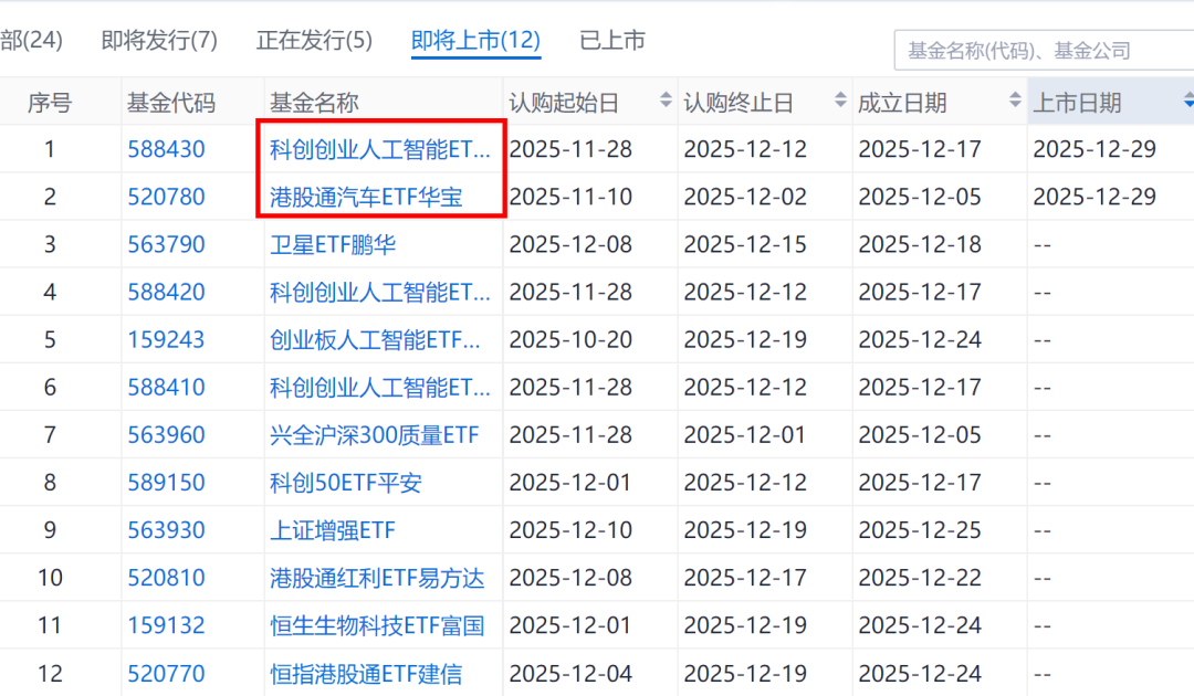 根据Go-Goal ETF数据,2025年最后三个交易日将有2只ETF发行,分别是科创芯片ETF华宝、科创芯片ETF广发。