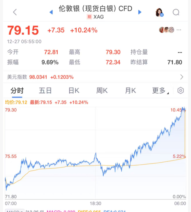 此外,国际银价26日再创新高。现货白银价格日内涨幅超10%,首次突破每盎司79美元,年内涨幅超170%。