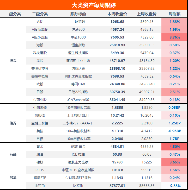 本周,A股全线上涨。上证指数上涨1.88%,沪深300上涨1.95%,中证1000大涨3.76%;港股方面,恒生指数上涨0.50%,恒生科技指数上涨0.37%。