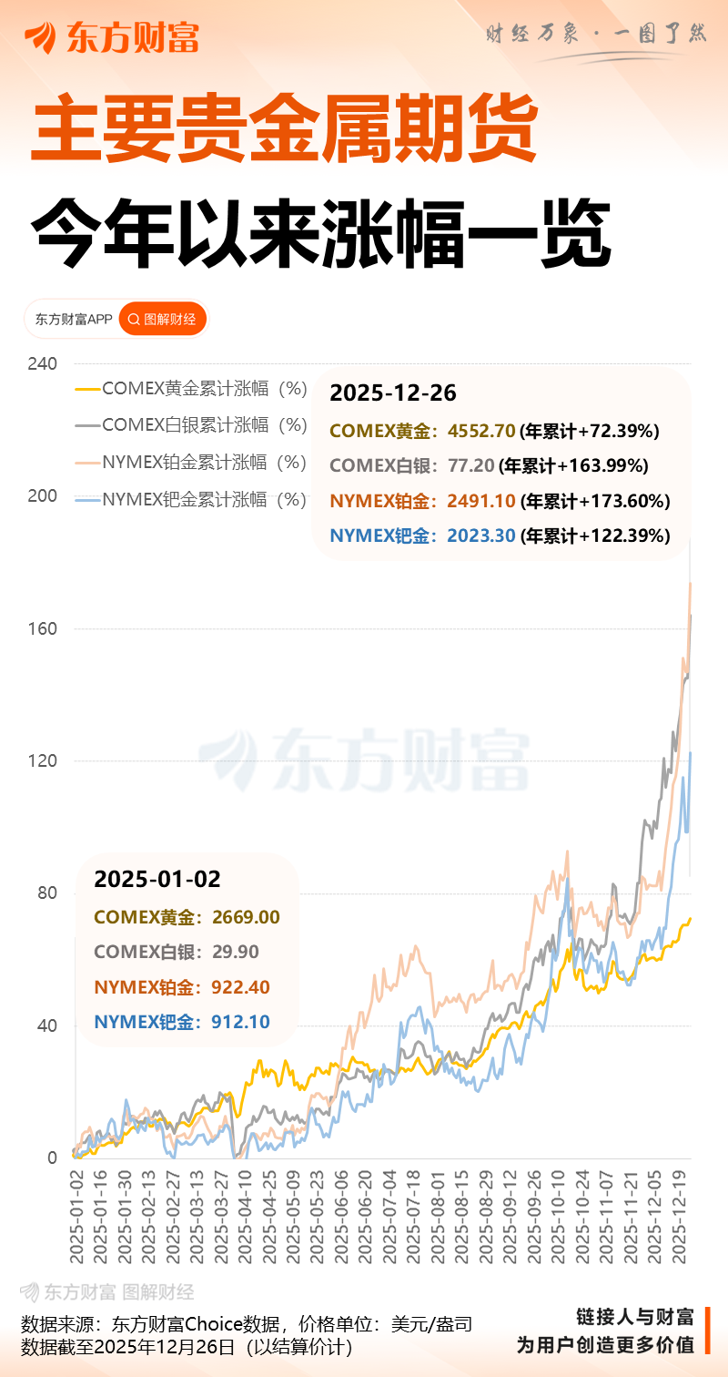 近期,国际金银快速攀升、屡创新高。截至上周五收盘,COMEX黄金期货、现货黄金涨超1%,周内累涨约4%;COMEX白银期货、现货白银均涨超10%,周内累涨约18%。现货钯金收涨超14%,周内累涨超12%;现货铂金收涨超10%,周内累涨超24%。