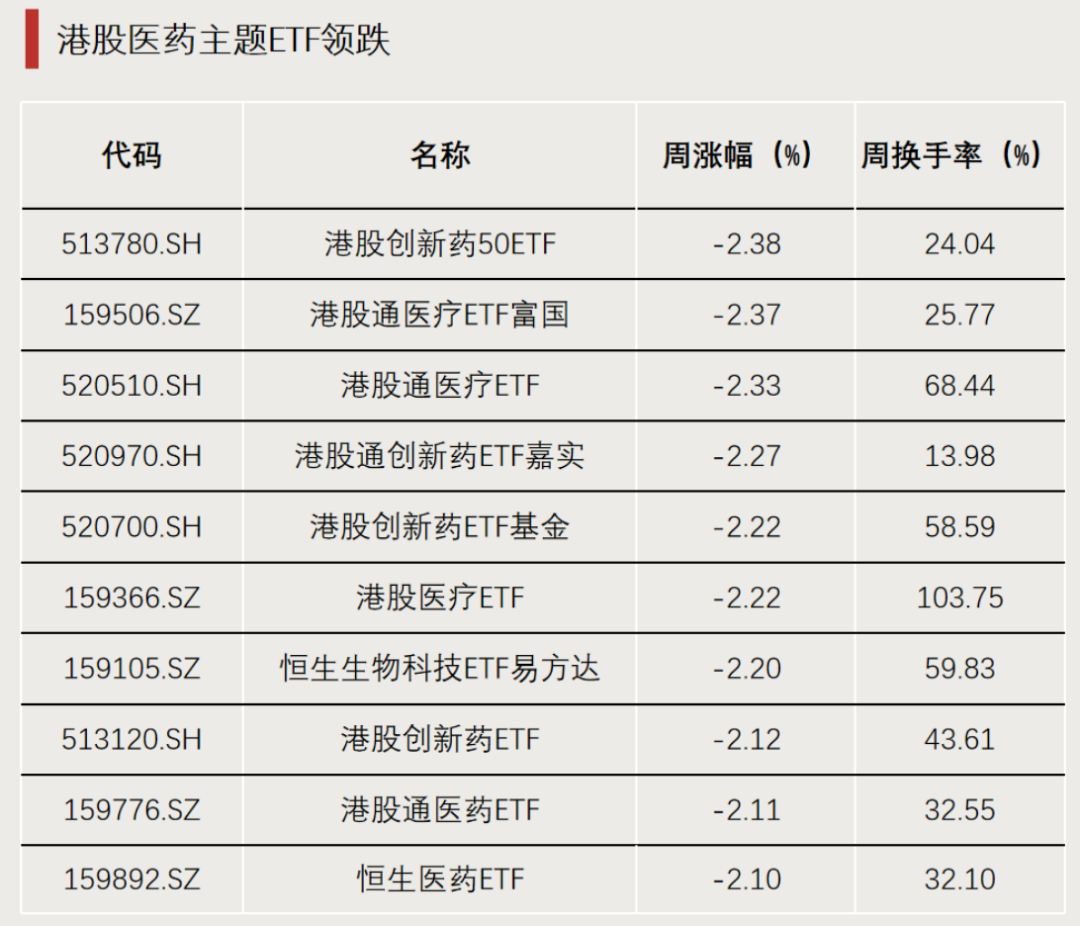 港股医药板块调整,多只相关ETF跌超2%,居跌幅榜前列。