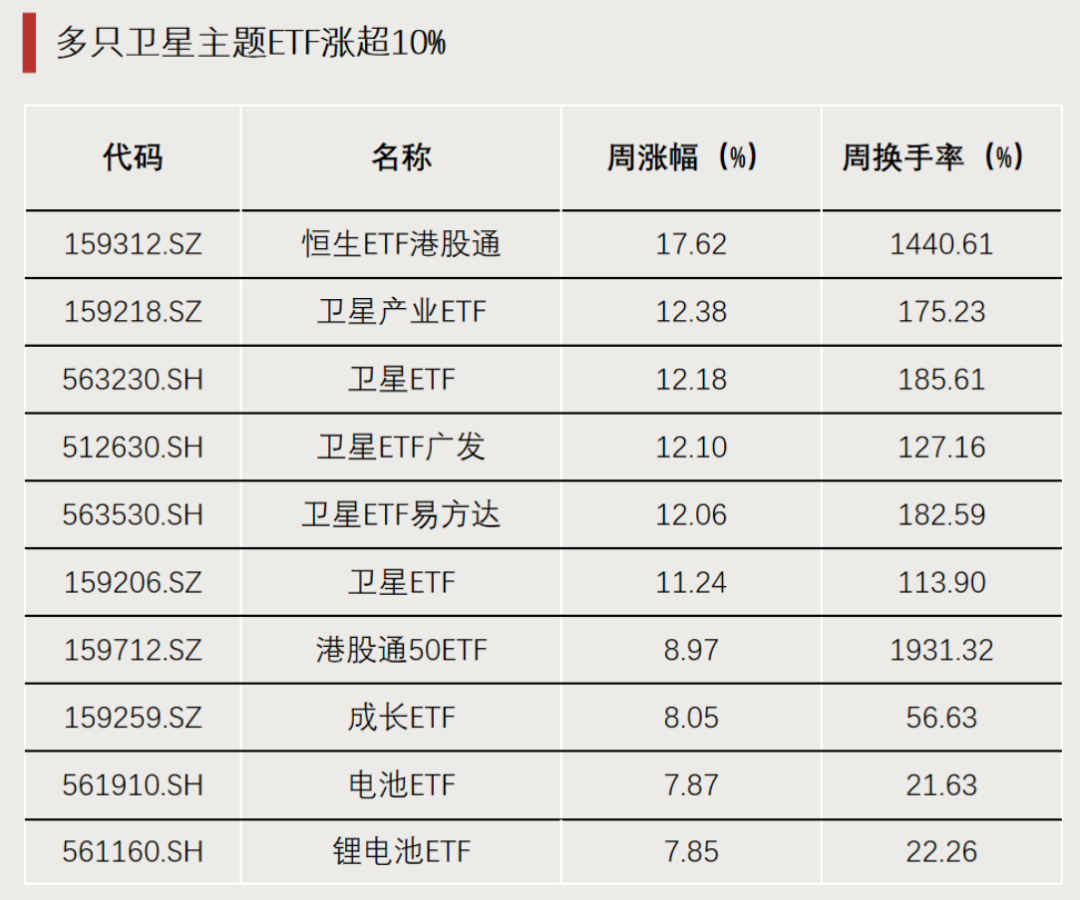 上周商业航天板块领涨,卫星ETF易方达(563530)跟踪的中证卫星产业指数涨超12%,多只卫星主题ETF涨超10%。锂电板块表现强势,多只电池主题ETF涨幅居前。