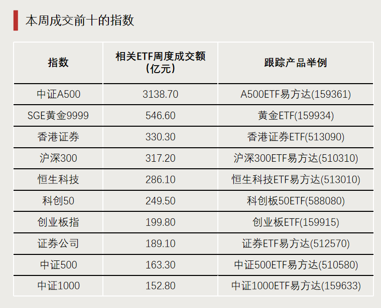上周大盘宽基产品成交活跃,其中A500ETF易方达(159361)等跟踪中证A500指数的ETF合计成交额超3000亿元。